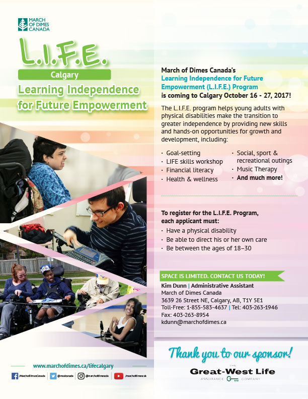 March of Dimes Canada’s Learning Independence for Future Empowerment (L.I.F.E.) Program is coming to Calgary October 16 – 27, 2017!