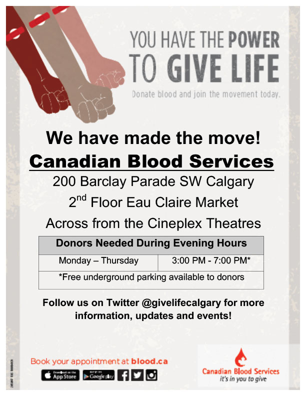 Canadian Blood Services has moved to 200 Barclay Parade SW, 2nd Floor Eau Claire Market (across from the Cineplex Theatres).