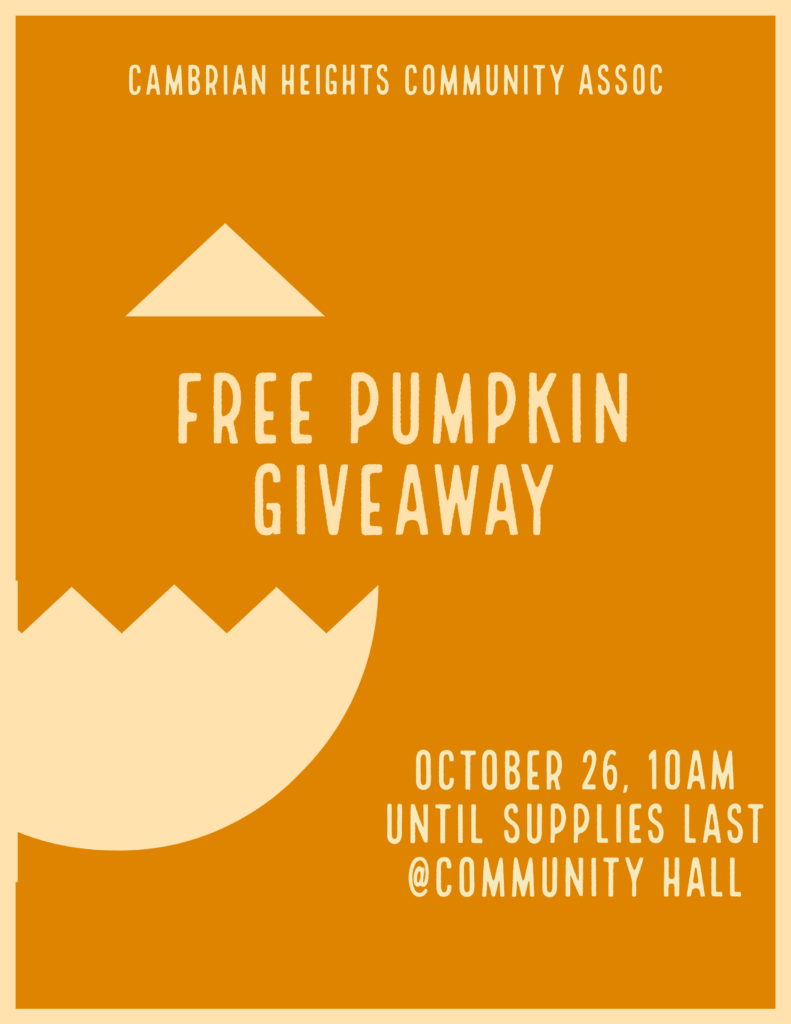 Come pick up your free pumpkin at the Cambrian Heights Community association on October 26th, 2024.