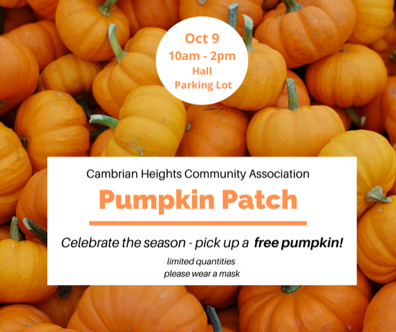 Celebrate the season with a free pumpkin! Cambrian Heights Community Association will be giving away free pumpkins on Saturday, October 9th from 10 am to 2 pm at the Community Hall Parking Lot.