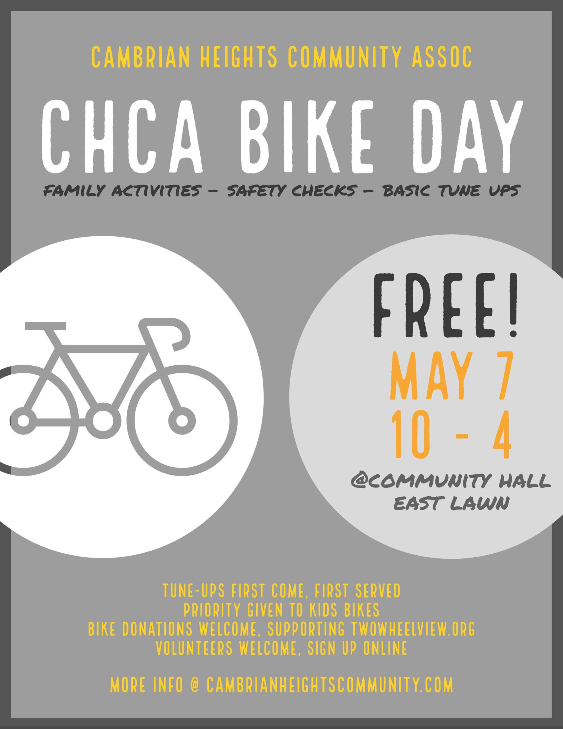 Cambrian Heights is hosting our first ever Community Bike Day on Saturday, May 7th from 10-4 at the Community Hall. The event will be held on the east lawn [Skating Rinks], or inside the Community Hall if the weather is poor.