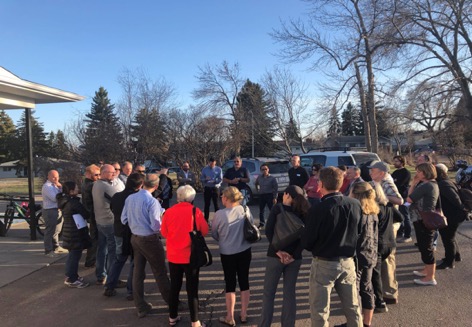 Two “drop-in engagement” sessions took place at Highwood Community Hall April 25 and May 9. The comment period for residents was held open till May 25. Calgary Parks continued however to disguise this Application as a dog park issue and presented the expansion of the QPC onto the second largest Park Reserve lands within Cambrian Heights as their sole right. They sought in their engagement sessions to address only two issues; alternative off leash dog areas and annotating the application process. No attempt was made to justify the need for QPC expansion and the annexation of this Park forever. The Community Association provided members outside the Hall for both these meetings to answer questions and explain the issues to residents attending the sessions. A photo from the first meeting is shown where the only true engagement with Parks and Planning representatives took place informally in the parking lot.